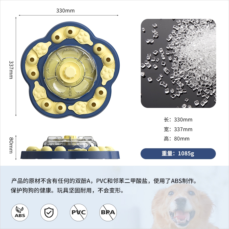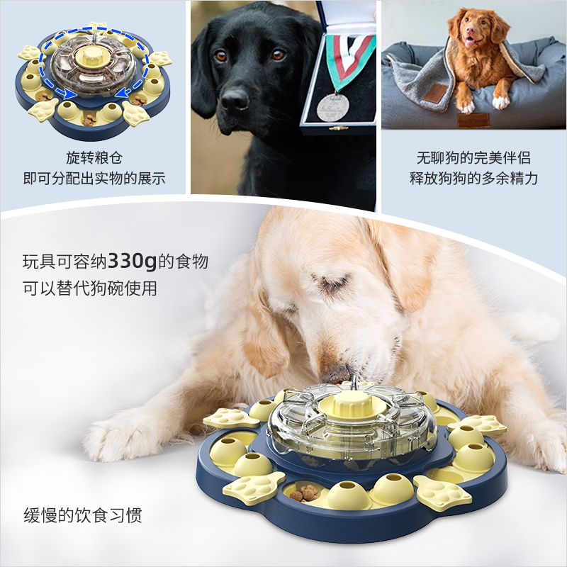 代号:智慧太阳花 这是一款创新设计的狗狗益智玩具,玩具采用了集中供粮设计,玩具主体的中央部件是一个食物储存盒,可以容纳330克的宠物干粮或者零食。玩具的周边有10个半球形的零食盒,储粮仓支持大部分体积的狗粮或者正方体的肉干。储粮仓可以旋转,当狗狗转动储粮仓时,储粮仓会随机向半球形的零食盒分配食物。狗狗需要推开零食盒就能够获得食物的奖励。这款玩具属于入门级和进阶级相结合的产品。可以根据宠物的实际状态来选择使用难度。适用于没有进行过智力开发的宠物或者已经有过初级开发智力的宠物使用。玩具可以做为慢食餐具给狗狗使用,玩具具有延缓宠物进食速度的作用,可以纠正宠物饮食速度很快的不良习惯,缓慢的饮食习惯可以更好的保护宠物的肠胃健康。狗狗通过玩耍玩具的过程中获得食物奖励,游戏的过程可以引导狗狗进行思考,让狗狗的大脑与身体同时运动起来,促进大脑发育。并可以通过获取食物的过程来刺激狗狗的精神,缓解狗狗的焦虑以及稳定狗狗的性格,让狗狗可以更好的融入家庭生活。