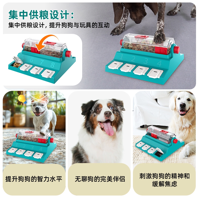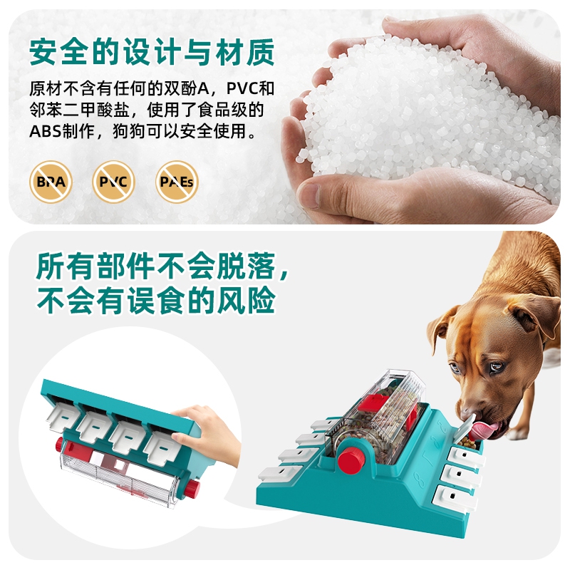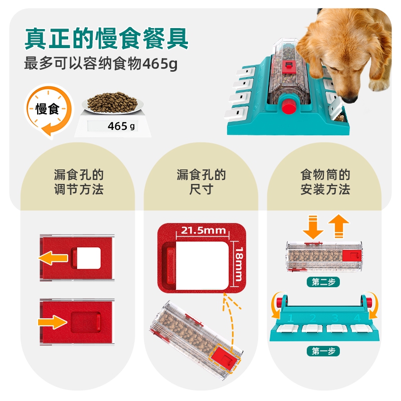 代号:聪明转转筒 这是一款创新设计的狗狗益智玩具,也是一个真正的慢食餐具。它与传统的益智玩具不同,玩具采用了集中供粮设计,宠物需要旋转食物筒完成食物分配。这款玩具属于入门级和进阶级相结合的产品。玩具有2个规格,一个M号,一个L号,M号专为小型和中型犬设计,L号专为大型和超大型犬设计。分别可盛纳390克和450克食物,玩具还可以调节食物的分配速度,以此控制宠物的使用玩具的时间和难度,并可以作为一个慢食餐具给狗狗使用,矫正宠物快速饮食的不良习惯,维护宠物的肠胃健康,也可以作为一个减肥餐具给体重过于肥胖的狗狗使用。